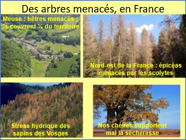 C’est ainsi que l’Office national des forêts a observé un accroissement de 80 % de la mortalité des arbres dans les 10 dernières années et estime que 300 000 hectares de forêts (soit 30 fois la superficie de Paris) sont déjà largement dépéris, et que 50 % de la forêt française pourrait avoir changé de visage d’ici 2070. A titre d’exemples :