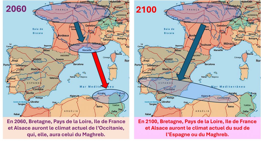Les agricultures bretonnes et alsaciennes devront, elles, rapidement s’inspirer de ce qui se passe actuellement en Occitanie, et à terme en Algérie ! Avec des pointes de température en été plus élevées en Alsace (où on risque de monter jusqu’à 55°) qu’en Bretagne (où on ne sera menacé « que » de 46°) !!!
