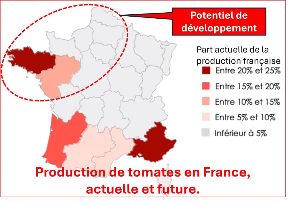 On l’a vu dans mon article sur l’avenir de la production de tomates dans l’ouest de la France, il est très probable que l’Espagne et le Maroc ne pourront plus cultiver de tomates dans les prochaines décennies. Or nous en importons 300 000 tonnes par an, la moitié de notre consommation ! Il y a place pour l’implantation de 1000 hectares de nouvelles serres de tomates, de La Rochelle à Brest et de Brest au Havre !